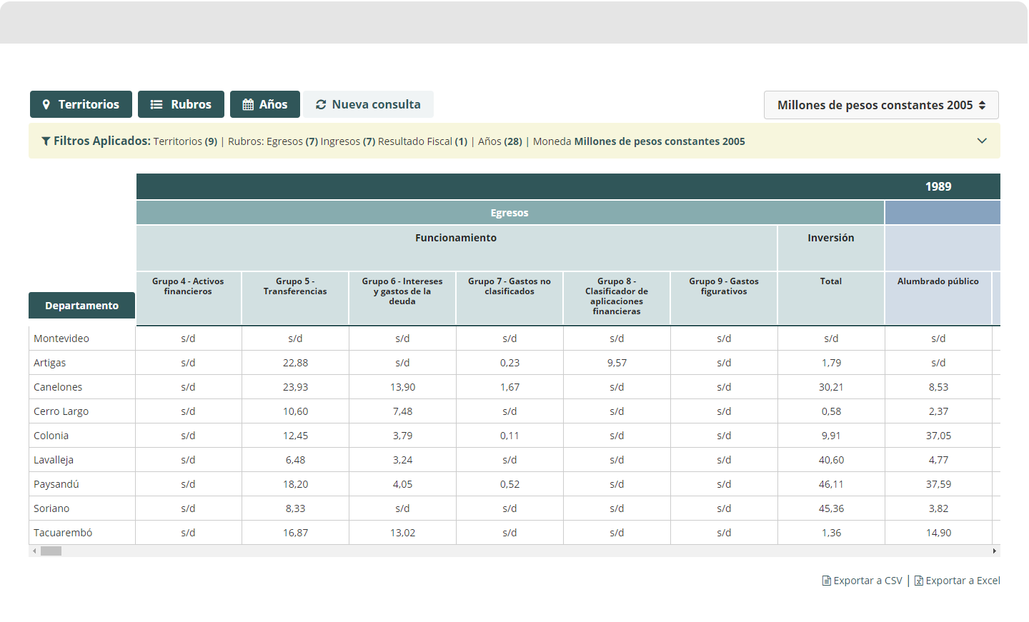 Acceda a los datos de ingresos y egresos de los Gobiernos Departamentales o egresos de los Gobiernos Municipales. Puede descargar las bases de datos completas o realizar consultas online.